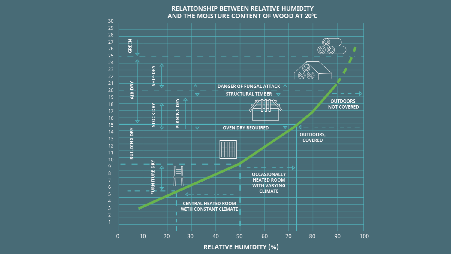Tämä kaavio havainnollistaa, miten 20 °C:een lämpötilassa varastoidun puun kosteuspitoisuus muuttuu varastointiolosuhteiden mukaan. Pystyakseli kuvaa puun kosteuspitoisuutta. Puun kuivuustasoja on kuusi. Tuoreen puun kosteuspitoisuus on yli 25 prosenttia ja huonekaluteollisuuden materiaalina käytettävän puun kosteuspitoisuus 5–9 prosenttia. Kun suhteellinen ilmankosteus pysyy tasaisena, puun ja puutuotteiden laatu säilyy korkeana eikä kutistumista tai vääntymistä pääse tapahtumaan.