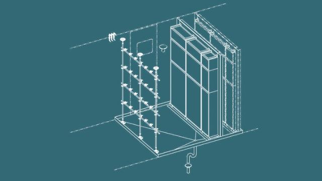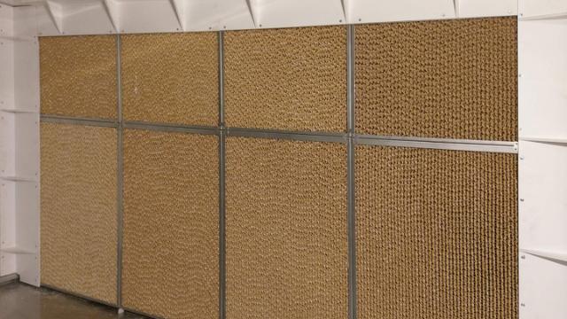 Tässä kaaviossa on kuvattu ilmanvaihtokanavaan asennettavan järjestelmän keskeisin osa, ilmankäsittelylaite. Kuvassa vasemmalla vesisumua syötetään kennoon oikealta etäisyydeltä. Oikealla puolella olevien erottimien avulla varmistetaan, että ilmanvaihtokanavaan ei pääse pisaroita vaan ainoastaan oikeassa kosteudessa olevaa ilmaa. Kuvan alaosassa näkyy lattiakaivo, johon liika vesi ohjataan järjestelmästä. Koko järjestelmä on korroosionkestävä, hygieeninen ja helppo huoltaa..